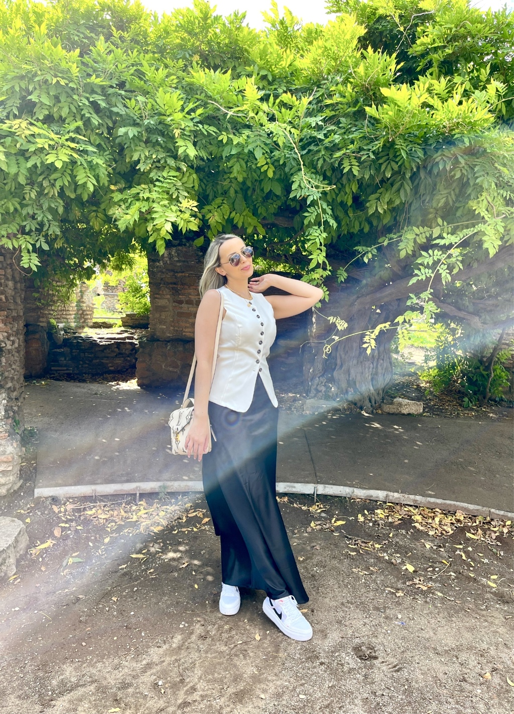 Os coletes são peças elegantes, sofisticadas que tiram qualquer look do básico. Trouxemos essa peça linda em alfaiataria com botões perolados e comprimento mais alongado, trazendo muito charme e requinte pra peça. Montamos uma proposta com saia, mas essa peca é super versátil podendo fazer várias combinações com calças ou shorts também. Seu recorte é mais acinturado, modelando e valorizando sua cintura.