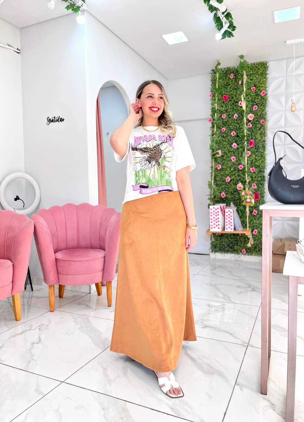 Uma coleção cápsula super exclusiva e com peças limitadíssimas da MYFT. A tendência Boho veio com tudo trazendo peças fluídas, babados, camurça, dentre várias tendências. Nossa saia maravilhosa em recorte evasê tem um caimento impecável no corpo. Seu tecido em camurça possui um toque macio e acetinado. Com fechamento em zíper é muito estruturada. Uma peça elegante, sofisticada cheia de estilo pra você compor diversos looks seja com salto como montamos ou tênis.